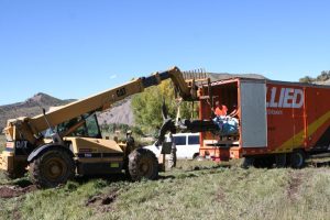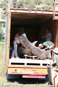 Because of water in the area, the Columbine truck got stuff for a short time. Todd’s (from Aspen Valley Landscaping) handy handling of the huge forklift got our truck unstuck and he carefully lifted and lowered and lifted and moved the statue to the back of the Columbine Moving and Storage truck. From there the Columbine crew, Seth, Gally, Gerry, and Tom secured the statue to the base of a crate that had previously been made at the Columbine warehouse. Lag bolts and heavy duty straps secured the sculpture to the base for safe moving to the Colorado Hall of Fame on September 27th, 2013.